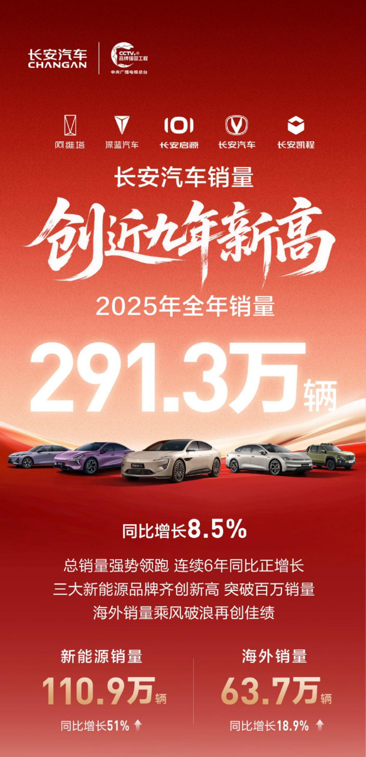 长安汽车2025年自主品牌销量达246.8万辆,同比增长10.86%,集团全年总销量291.3万辆创下近9年新高,连结6年罢了同比正增长,妥妥的自主阵营“后劲股”。其中,新能源销量突破110.9万辆,同比激增51%,收效置身“新能源百万销量俱乐部”,成为销量增长的中枢驱能源;外洋销量达63.73万辆,大家化布局合手续提速。