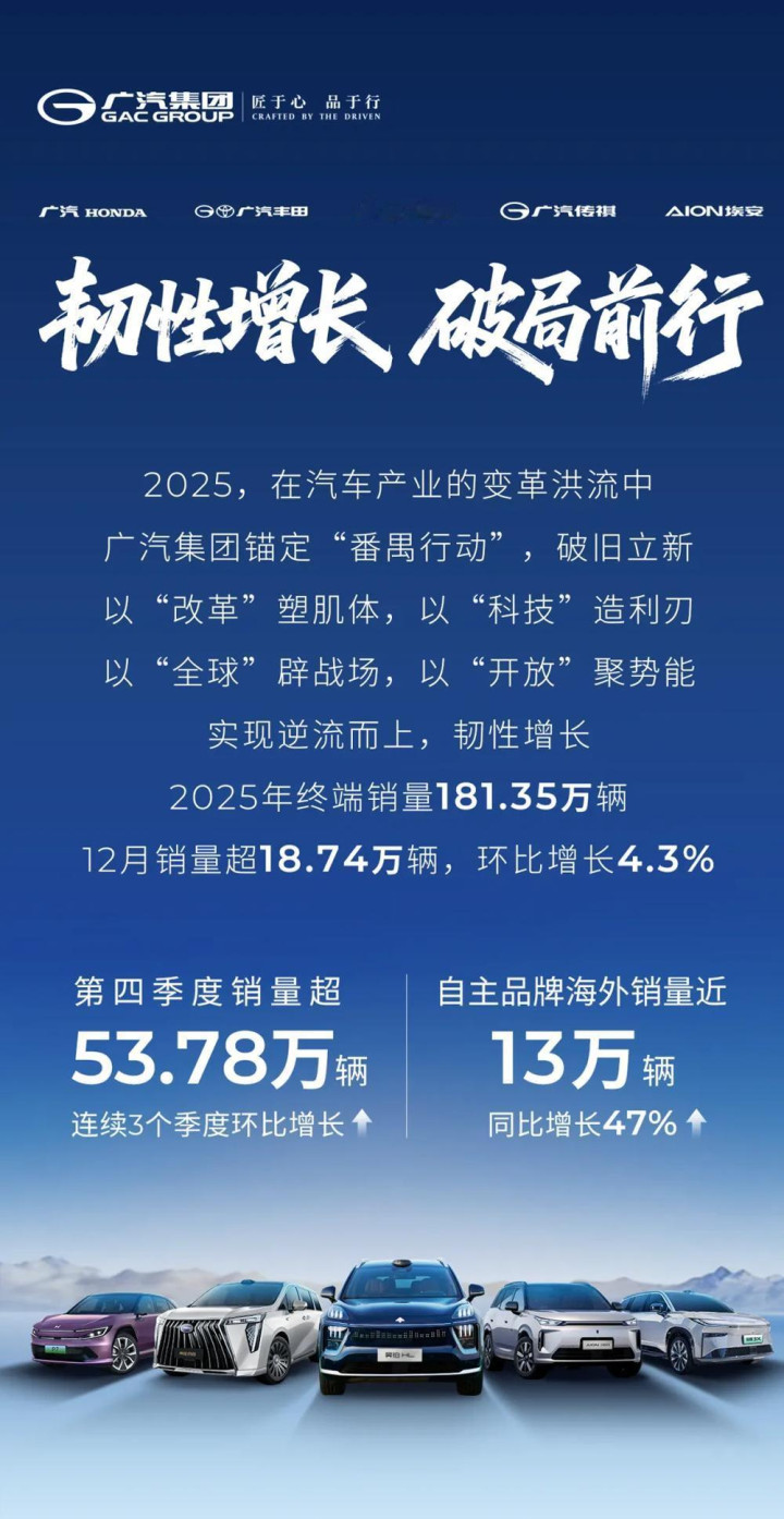 广汽集团2025全年汽车销量172.15万辆,全年终局销量181.35万辆(含结伙品牌)。数据表示,第四季度全集团销量超53.78万辆,较第三季度增长25.56%,连结三个季度销量罢了环比正增长,且增速不停扩大。同期,广汽外洋拓展提速,自主品牌全年外洋销量近13万辆,同比增长47%。