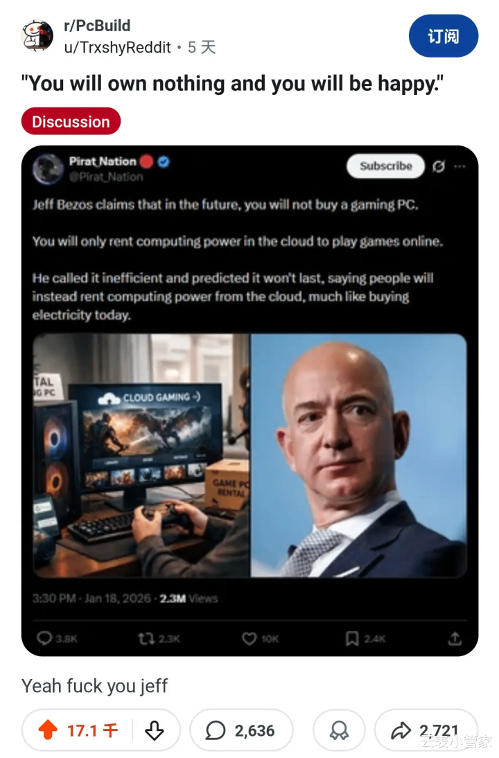 这话一出,网友吐槽径直刷屏。有东说念主怼“亚马逊被淘汰的概率皆比电脑高”,也有东说念主辱弄“莫得电脑,云端租给谁用?”,更有硬核网友直言“离线场景怎样办,断网就停工?”。