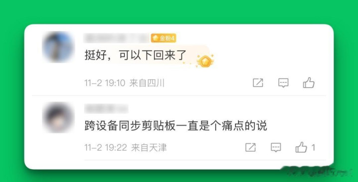 复制完无须等,无须下拉见知栏,也无须点“同步”按钮。在iPhone上长按选中一段,点“复制”,切到Mac浏览器地址栏,点一下就弹出浮层,点进去就粘上了。Android更干脆,复制完回到微信聊天框,键盘一弹,右下角径直浮个小窗口,点一下就贴。唯独卡顿的是iOS——你得先点一下输入框,把键盘叫出来,它才反应。不是输入法的问题,是苹果系统不让第三方输入法在无焦点时调用剪贴板。
