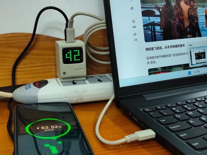 这款麦金塔充电器颜值走守旧作风,放在办公桌上像个超小的电脑模子。67W 的大功率,不仅能给手机、平板快充,还能平直给 Macbook、华为条记本充电,兼容苹果、华为、小米等各式品牌。当充电头抵挡务时刻,清醒屏便是妥妥的“黑客帝国”状况。