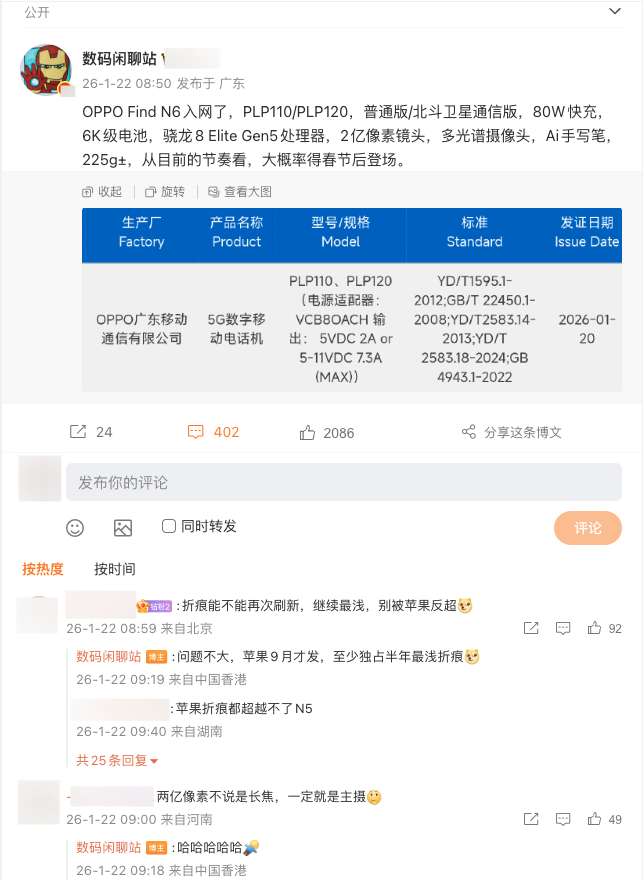 {jz:field.toptypename/}另外OPPO Find N6其他建立参数也挺吓东说念主的,6000毫安的大电板塞进去,分量还能控在225g傍边?还有第五代骁龙8至尊版贬责器,2亿像素的镜头...这建立当主力机用澈底没问题,订价确定也不会像苹果通常1万5那么离谱。