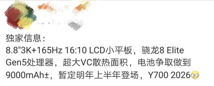 从现存信息来看,调停者Y700 2026款的硬件设立将是国产小平板中最顶级的那一档的!
