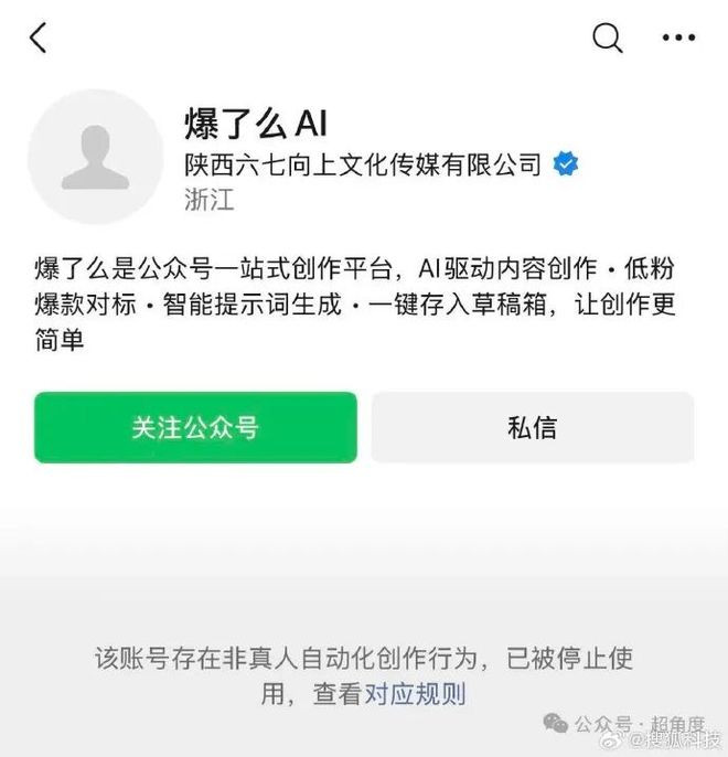 但是,仅过数日,经查询发现,其公司公众号“爆了么AI”已被平台封禁,指示“该账号存在非真东谈主自动化创作活动,已被罢手使用。”