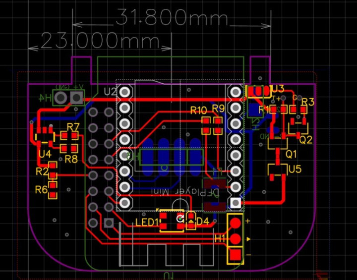 MP3模块和ESP32选用的正反面类似的方法叮咛,考虑到这么会有一个模块的一边引脚在另一个模块的底部,焊合会有蹧蹋,是以ESP32在旨趣图狡计时就只使用了一边的引脚,灭亡另一边引脚的使用。