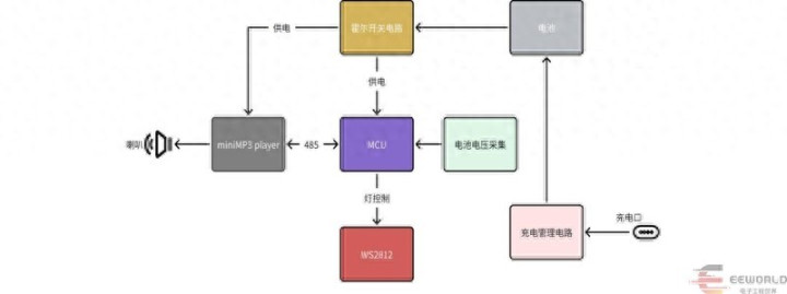 主要包含主控MCU、MP3模块、电板、电板充电贬责以及采样电路、霍尔传感器开、灯、喇叭等