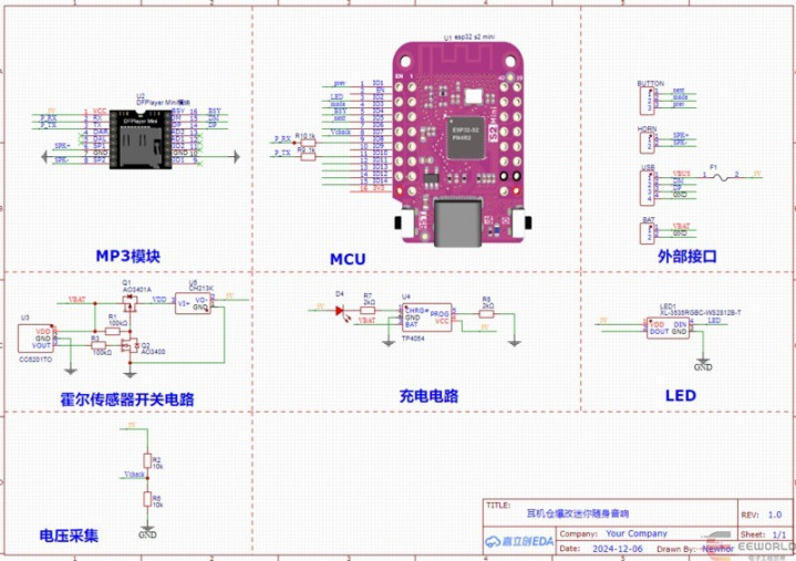 MCU选用的时ESP32-S2MINI模块,主邀功能用于与MP3模块通讯、放手灯的不不异式亮度、采样电板以及触摸按钮网罗,考虑到该模块体积小以及领有触摸按键功能。不错看到所有这个词电路其实只用到了几个引脚就够了,如果使用物理按键的话,这里选用引脚更少的ESP32-C3MINI亦然够用的,同期体积和本钱更好。