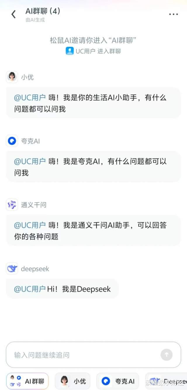 与单一AI助手交互花样不同,UC推出的AI群聊为多Agent架构,群聊默许成员包含四大智能体:UC浏览器原生智能AI助手“小优”、阿里系同门夸克AI,通义千问,以及外部合作的Deepseek,变成了跨体系智能交互矩阵。