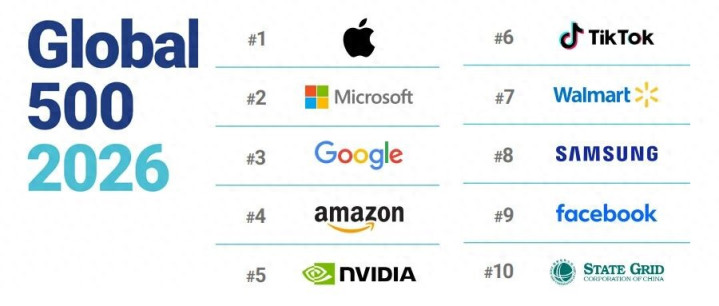 (财见2026年1月26日讯)英国品牌评估征询公司“品牌金融”(Brand Finance)发布“2026年全球品牌价值500强”榜单(Global 500 2026),苹果、微软、谷歌、亚马逊位居前四,英伟达升至第五名。中国品牌中,抖音/TikTok升至第六位,国度电网名次第十。