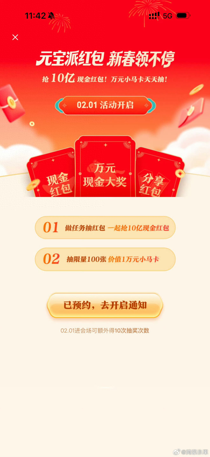 腾讯元宝秘书2月1日上线春节步履,向用户派发10亿元现款红包。