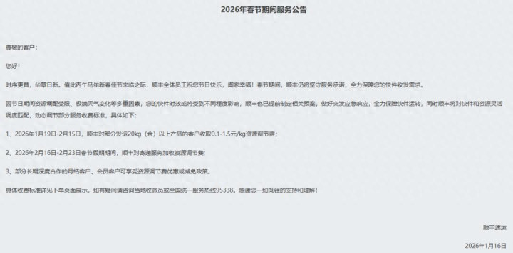 2、2026年2月16日-2月23日春节假期时分,顺丰对递送就业加收资源调整费;