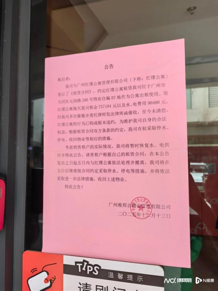 番禺亚运城店魔方公寓牌号已被庇荫,步地已被收回暂处于空置景色。门上张贴的公告自大,位于广州市番禺区石楼镇南派村的魔方公寓系由广州福盛物业发展有限公司出租给广州红璞公寓贬责有限公司(简称红璞公寓),因过期交纳房钱晋升30天,自2025年12月1日起撤废两边的租借条约关连。公告中提到的广州红璞公寓贬责有限公司,就是魔方生涯劳动集团旗下企业。