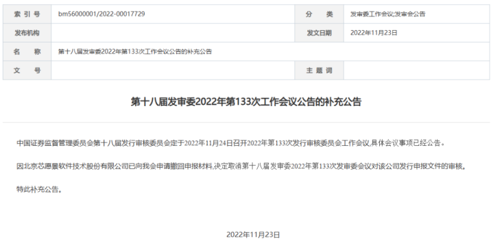 2021年6月2日,芯愿景线路已于5月11日与民生证券签署蛊卦公约,拟在深交所主板IPO。2022年1月6日,公司预线路了招股书(文牍稿)。2022年11月23日,中国证监会公告,因芯愿景央求除去文牍材料,决定取消第十八届发审委2022年第133次发审委会议对该公司刊行文牍文献的审核。