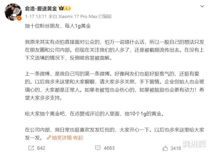 而在微博上,俞浩也曾延续大手笔的画风,动不动就给网友送黄金,雷同是每东谈主1克黄金。这一亲民举动深受雄壮网友接待,马上拉近与网友的距离。为此,他专门把微博昵称改成“俞浩-爱送黄金”。同期,俞浩还奖励追觅生态的投融资团队绩优职工去南极旅游,且是飞机直达,不是坐船往日,不愧是别东谈主家的雇主。