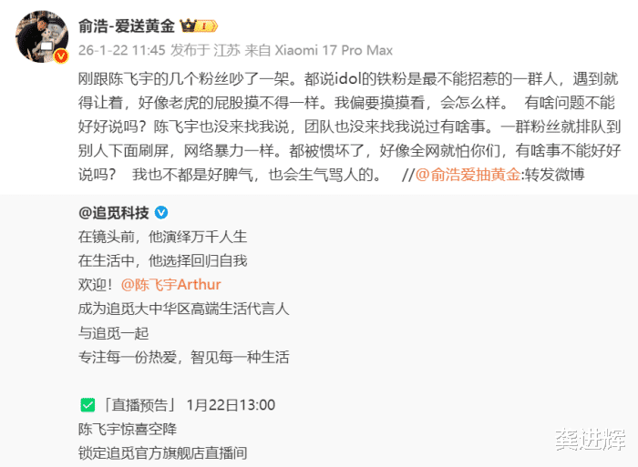 其次,他很真性情。除了张凌赫除外,陈飞宇亦然追觅代言东谈主。你敢联想,行为金主爸爸的俞浩果然会跟陈飞宇粉丝吵架。不外,这照实是真的,事件缘故是追觅官微通知陈飞宇为追觅大中华区高端活命代言东谈主后,一群粉丝列队到驳倒区刷屏,这让俞浩很不爽,径直下场与他们表面,“我也不齐是好性情,也会不满骂东谈主的。”