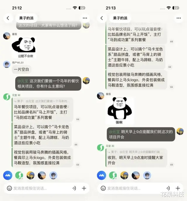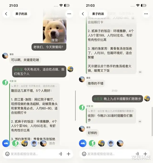 比如说派成员念念要聚餐,但不知谈吃啥,不错径直@元宝给出稳妥的提议,还能让元宝提示聚餐后监督全球散布。