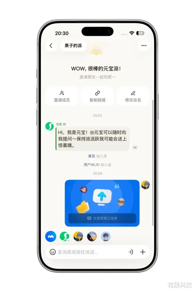创建好的派不错邀请成员,不错将派交融为有 AI 的群聊,也便是说派内除了有真东谈主除外,还有元宝 AI,不错径直在派内@元宝参与聊天照应。