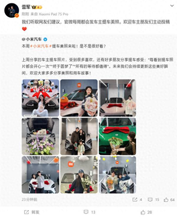 快科技1月26日音讯,最近,小米汽车官微初始晒出无数车主提车相片,呈现不少温馨时辰。 小米独创东谈主雷军今天发文流露,这是听取了网友的提倡,官微将每周发布发车主提车好意思照,也宽宥车主一又友们主动投稿。