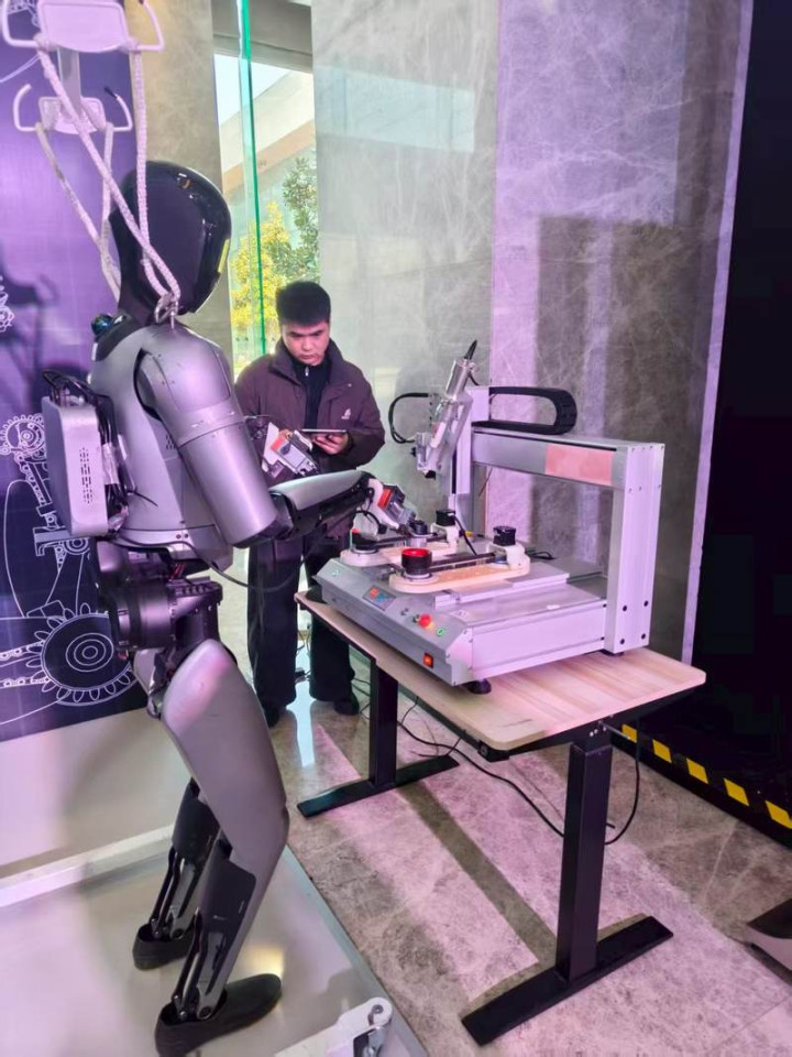 魔法原子东谈主形机器东谈主正展示在工业场景中的智商。新京报贝壳财经记者韦博雅摄。