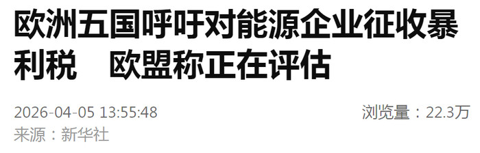 欧盟委员会又名发言东说念主4日阐明,收到五个欧盟成员国条件对动力企业征收暴利税的建议,正对此进行评估。