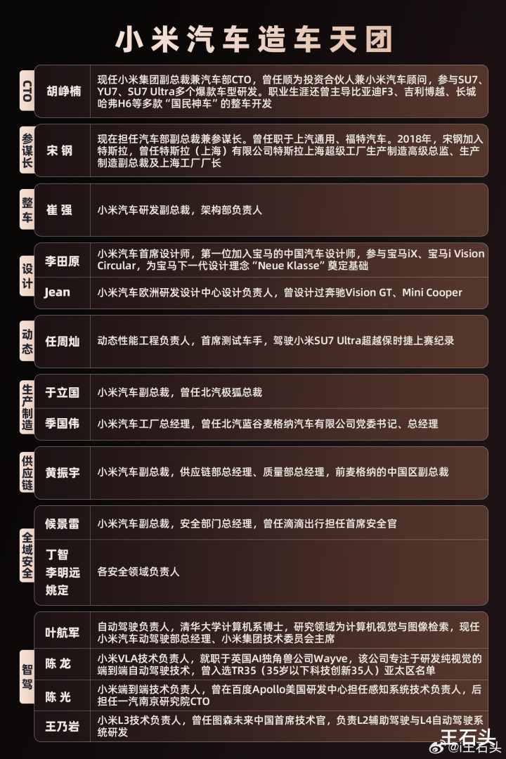 从雷军躬行挂帅,到原祯祥讨论院院长胡峥楠镇守CTO,再到领有特斯拉、福特、上汽多重配景的宋钢担任照拂长,再加上此前如故聚合的一批来自国表里顶级车企的主干力量,这支戎行的资格厚度和实战申饬,放在通盘中国汽车行业都极具竞争力。