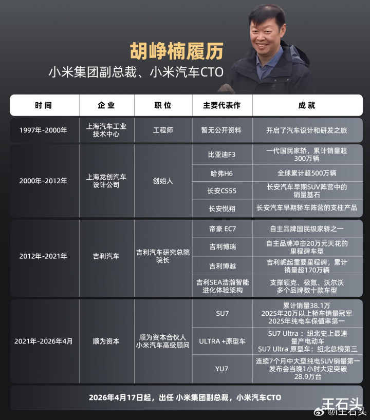 一句话总结:东说念主才是小米的必争之地!小米集团短暂晓示,胡峥楠出任小米集团副总裁,汽车部CTO,补皆汽车部CTO,标记着小米汽车风雅插足第二阶段。