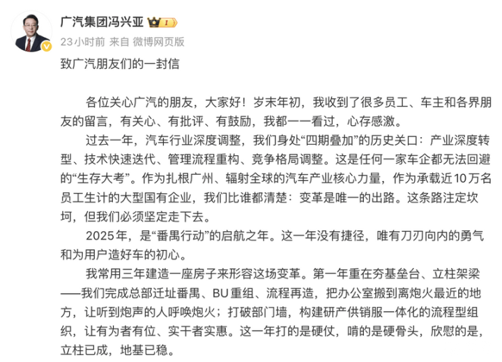易车讯日前,广汽集团董事长冯兴亚发布《致广汽一又友们的一封信》,回想了广汽集团往常一年履历的变化、获取竟然立,以及广汽集团三年番禺活动霸术,称变革是独一前程。
