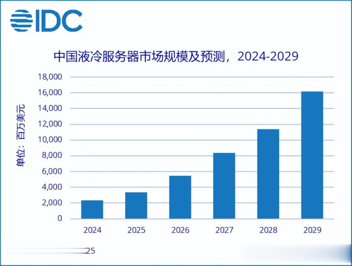 2024年,中国液冷做事器市集照旧展现出苍劲的增长势头,全年出货量终点23万台,市集规模达到23.7亿好意思元,同比增长67.0%。这一数据仅仅液冷市集爆发的一个最先,据瞻望,到2029年,中国液冷做事器市集规模将攀升至162亿好意思元,2024 - 2029年年复合增速高达46.8%。这意味着,液冷做事器市集在畴昔五年内仍将处于一个超高速增长的黄金时期。