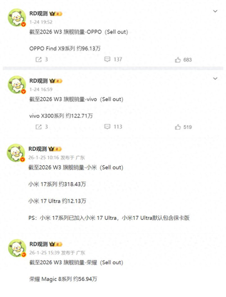 这是行业东说念主士“RD不雅测”提供的截止2026年W3周国产几大旗舰的累计销量数据,数据表现:现时vivo X300系列的累计销量达到122.71万台;OPPO Find X9系列的累计销量达到96.13万台;小米17系列的累计销量达到318.43万台,虽然这个销量是包括小米17 Ultra系列的;荣耀Magic8系列的销量达到56.94万台。看到了吗?小米17系列如故冲破300万台,正朝着320万台以至是350万台而去,现时依然是国产同档居品销量最高的。友商的旗舰销量根柢与它不在一个头绪之上,这个没东说念主会去否定。