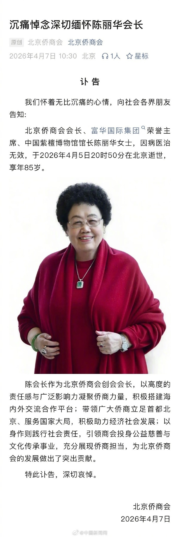 讣告称:北京侨商会会长、富华国外集团荣誉主席、中国紫檀博物馆馆长陈丽华女士,因病医治无效,于2026年4月5日20时50分在北京衰一火,享年85岁。