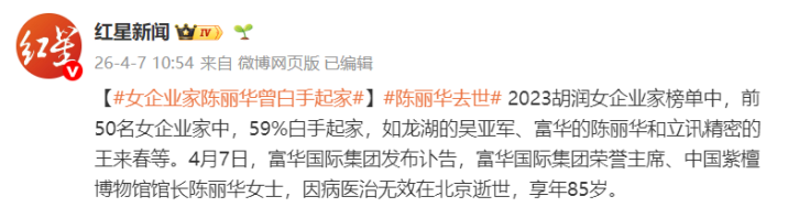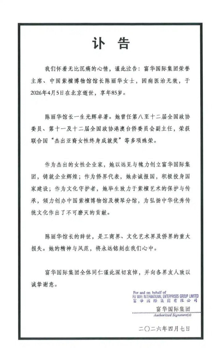 此前,富华国外集团发布讣告:富华国外集团荣誉主席、中国紫檀博物馆馆长陈丽华女士,因病医治无效,于2026年4月5日在北京衰一火,享年85岁。