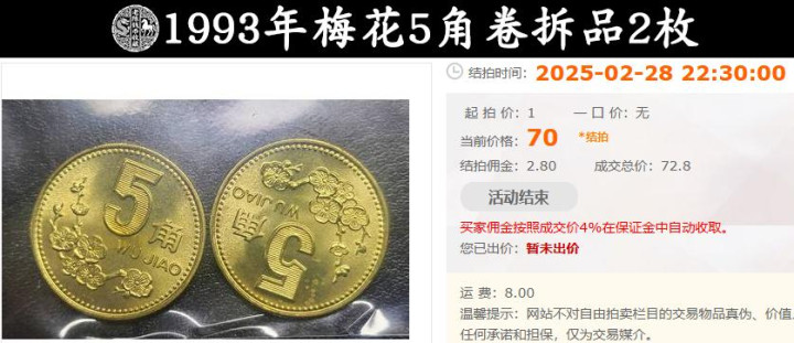 比如说之前在现代钱币的自由拍卖会上,两枚93年的卷拆品,拍出了72.8元,这样的身价,虽说不是很高,但也和流通品拉开了差距。
