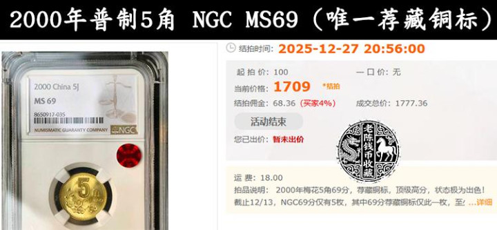 要知道,截至今年12月,69分的2000年梅花5角,评级系统里面也仅仅只有5枚,而带有这个铜标的,更是仅有这么1枚。