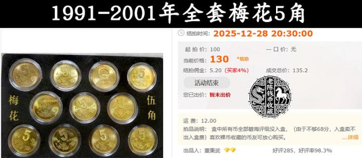 就在今年12月28号的时候,有一套就拍出了135.2元,虽然平均下来每枚溢价不算很高,但好歹能够顺利变现,对于普通爱好者来说,也算是比较好收藏到的。