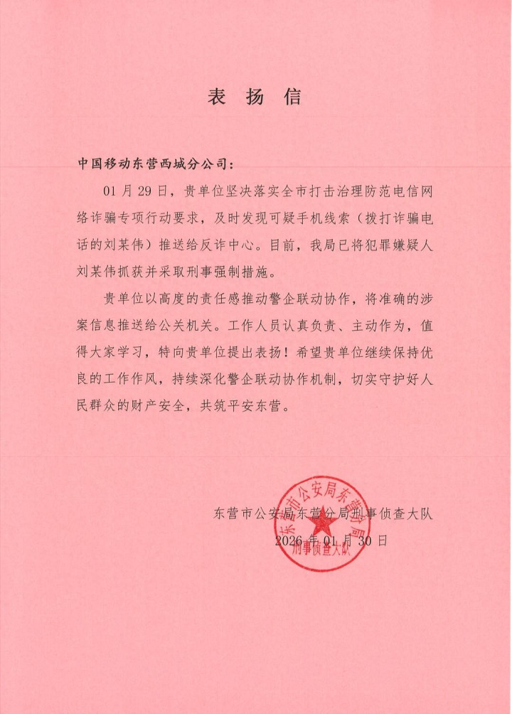 近日,山东移动东营西城分公司收到来自东营市公安局东营分局刑事侦查大队的表扬信,对公司在打击治理电信网络诈骗专项行动中的突出贡献给予高度肯定。