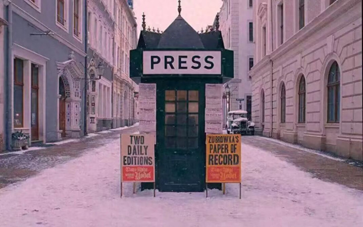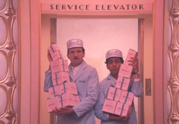 影片里自便的粉色氛围,尤其是饭铺里面的粉红色调象征着旧欧洲的优雅与空虚。布达佩斯大饭铺被这种黑甜乡般的氛围包裹着,远隔阳世和时期车轮,半山腰而立,远隔尘嚣,象征着饭铺创立者古斯塔夫先生的精神郊外和对漂后的向往。
