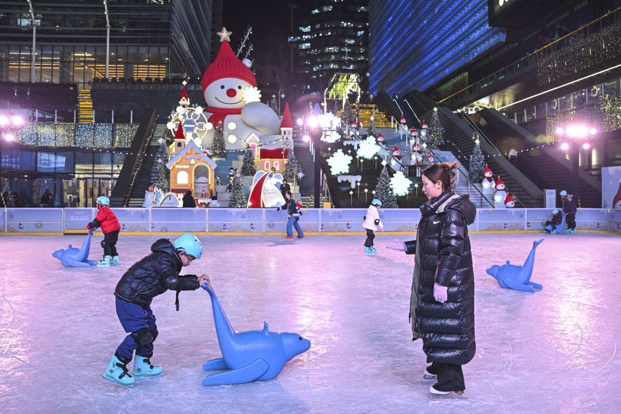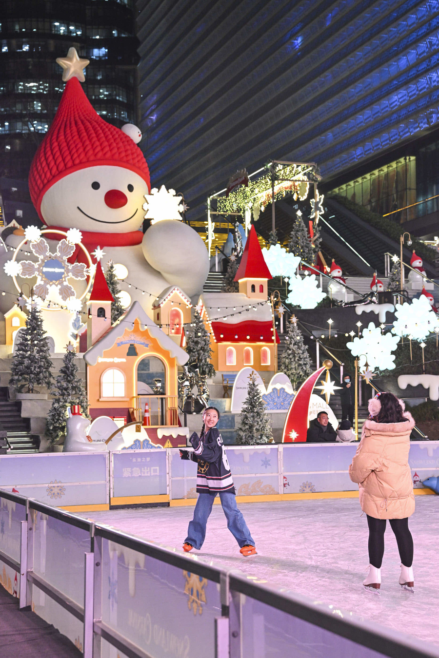 陆家嘴中心L+Mall下沉广场变身雪上乐园,都市楼宇与红帽雪人相映成趣