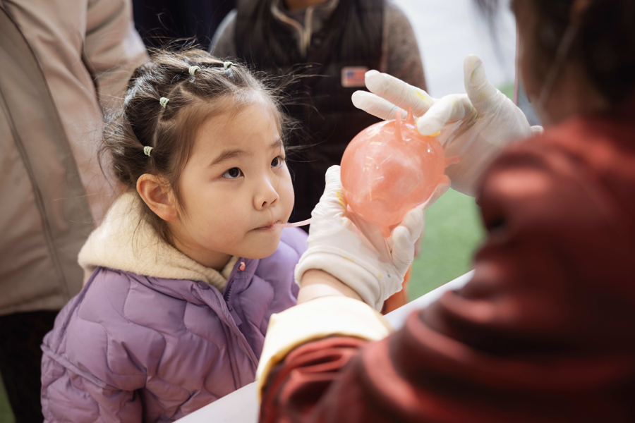 静安久光步行街上,一名女孩正在体验非遗吹糖人