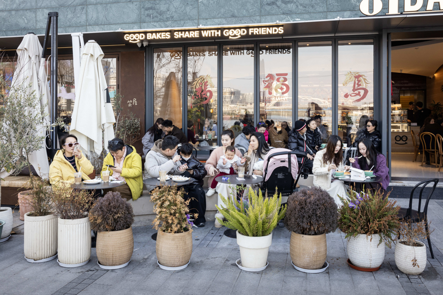 西岸梦中心滨水空间,咖啡香气漫入江风,市民正享受午后闲暇
