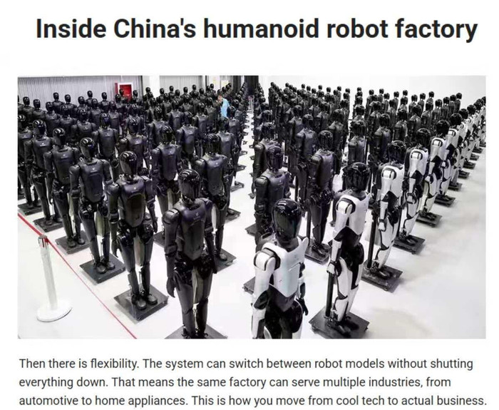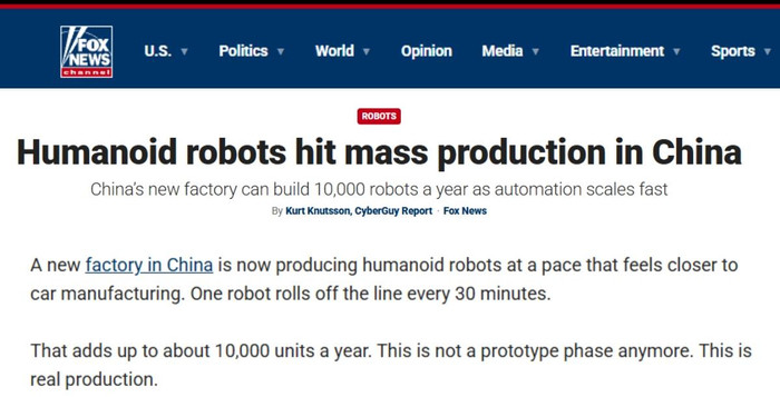 好意思国福克斯新闻网近日刊文称,跟着自动化坐蓐的快速限度化,中国的一家新工场正以接近汽车制造的速率坐蓐东说念主形机器东说念主——每30分钟就有一台机器东说念主下线。这意味着年产量可达约一万台。著述惊奇说,这不再只是原型阶段,而是委果的量产。