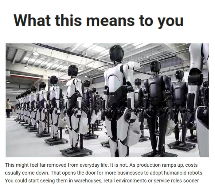 著叙述,东说念主形机器东说念主的普及欺骗好像会让东说念主合计与普通糊口相去甚远,但事实并非如斯。跟着产量的普及,老本经常会下跌,这为更多企业袭取东说念主形机器东说念主掀开了大门。东说念主们可能会比预期更早地在仓库、零卖环境或干事岗亭上看到它们。这一滑变的速率尤为引东说念主妥当:旧年还嗅觉像是考试性的东西,如今正朝着主流部署迈进。
