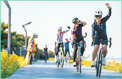 骑行爱好者在山东日照市阳光海岸绿道锻炼健身。