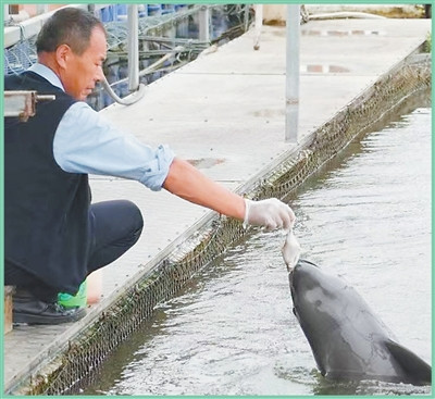 在湖北石首市长江天鹅洲白鱀豚国家级自然保护区,饲养员向网箱豢养的江豚投喂小鱼。