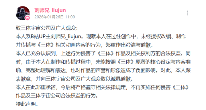 IT之家1月26日音尘,B站UP主刘师兄_liujun当天针对过往创作中,未经授权改编、制作并传播与《三体》关连动画履行的看成,发布谈歉声明。