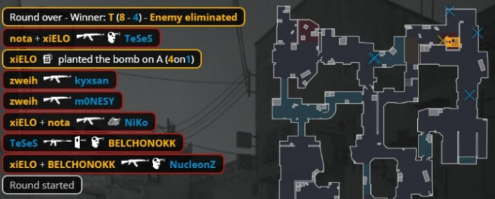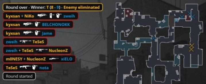 回到蛇矛局,孩神埋伏CT家箱子看中路双杀后掉狙,随后Niko与核爆哥各杀一个,时辰消耗,天主拿到孩神大狙三杀难拿分。次回合龙哥中路绕后刀掉天主,nota站住B点单局三杀扳平比分。