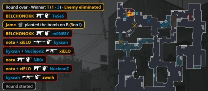 全场结尾,猎鹰倒数30s冲A小,zweih换掉K3,核爆进A下包,KK平台双杀,nota再杀核爆哥,Niko残局1v3无力回天被nota击杀,PV以13-11赢下图二拿到赛点!