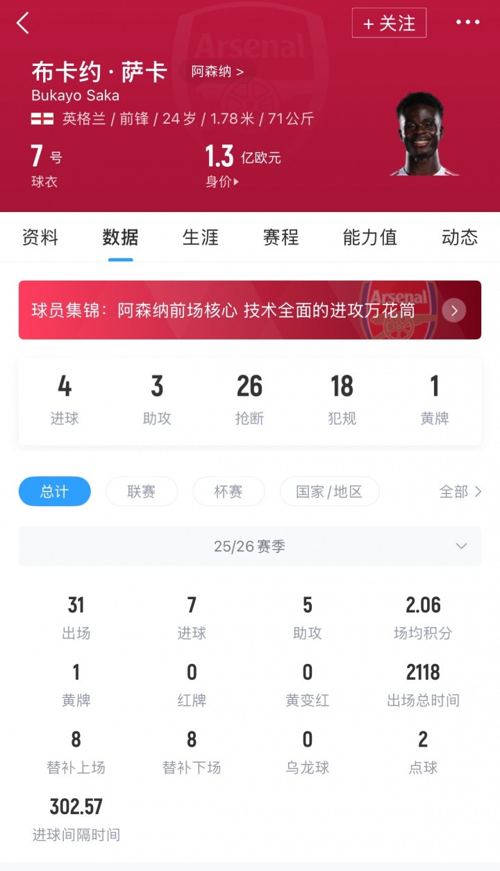 直播吧01月26日讯本轮英超阿森纳主场2-3不敌曼联,本场比赛萨卡首发打满全场,莫得孝敬进球与助攻。