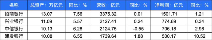 跟着浦发银行、中信银行快报此前接踵表示,国内总资产超10万亿元的银行已引申至10家。现在,“10万亿俱乐部”的四大股份行事迹快报已整个表示完毕。