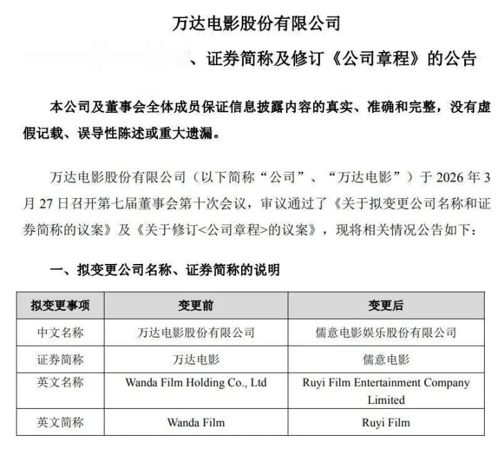 3月27日,万达电影发布公告,秘书拟改名为“儒意电影文娱股份有限公司”。据悉,改名后,儒意电影将在超等文娱空间政策下聚焦“超等场景+超等IP”,升级线上线下文娱体验,深耕文化文娱全产业链。