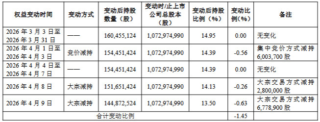 自公司2026年3月3日流露《对于控股鼓舞偏执一致当作东说念主权利变动涉及1%及5%整数倍暨流露简式权利变动呈报书的公告》后至2026年4月9日,新银国外偏执一致当作东说念主李勍先生共计捏有公司股份数目由160,977,794股变动至145,395,194股,共计捏股比例由15.00%变动至13.55%,涉及了1%的整数倍。